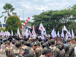 Tak lama orasi diperdengarkan Gubernur H.Muhidin beserta Wakil Gubernur Bapak H. Hasnuryadi turut menemani menghadap para penyampai aspirasi.